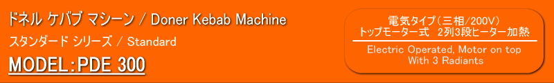 | 【商品説明】 ドネル ケバブ マシーン PDE 300 ・3相200V(動力)を使用した電気タイプ。 ・角度の付いた2列のセラミックヒーターが3段になっている ことでお肉を十分に焼くことができ、各段ごとに火力の調 整が可能です。 ・上部にセットされた回転モーター(1rpm)は左右回転の切 り替えスイッチ付いています。 ・上部モーター部と下部をスライドさせることで肉とヒーターと の距離を変えることが出来ます。 ・ショベル、オイルパンが付属しております。 *本体にコンセントが付いていますが使用できません。 【General Features】 ・Horizontal ceramic heaters (2 heaters each row , total 3 rows ) operated seperately , ・Shovel , draining sheet and oil collecting tray in s/s , ・Special motor (1 rpm) resisting to high temperatures, rotating left/ right ・Sliding upper and lower sliding housingds of the skewer for bringing meat closer to or taking away meat from the heaters , ・Equipped with a fused socket for electric doner kebap knife . |