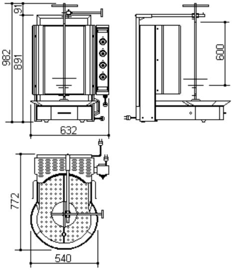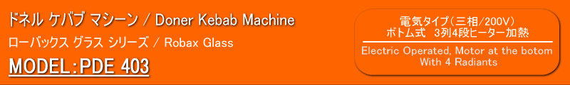 | 【商品説明】 ドネル ケバブ マシーン PDE 403 ・3相200V(動力)を使用した電気タイプ。 ・ローバックス グラスは、ヒーターに直接油がはねるのを防ぎ、湾曲になっていることで熱の伝導率が良く、均等な焼き上がりを実現しました。また、お手入れが簡単で衛生面に優れており、安全性の高い高品質マシーンです。 ・湾曲になった3列のセラミックヒーターが4段になっており、各段ごとに火力の調整が可能です。 ・下部にセットされた回転モーター(1rpm)は左右回転の切り替えスイッチが付いています。 ・本体を前後に稼動する事で肉とヒーターの距離を調整することが出来ます。 ・ショベル、オイルパンが付属しております。 *本体にコンセントが付いていますが使用できません。 【General Features】 ・Horizontal ceramic heaters (3 heaters each row , total 4 rows )operated seperately , ・Shovel , draining sheet and oil collecting tray in s/s , ・Special motor (1 rpm) resisting to high temperatures, rotating left/ right ・Controlling the distance between the radiants and meat with the movement of the heating group and the relevant upper body to the back and forth , ・Equipped with a fused socket for electric doner kebap knife ・Homogeneous cooking due to the heaters covering the meatin a cicular way and the special glass with high conductivity of heat in front of the heaters , ・Cooking in a hygienic and safe way by means of heat resistant glass in front of the heaters preventing the splashing of the fat to the heaters |
