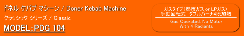 | 【商品説明】 ドネル ケバブ マシーン PDG 104 ・都市ガス又はLPガスを使用するタイプです。 ・セラミックヒーターは金網で保護されており交換も簡単にできます。 ・1列のダブルセラミックヒーターが4段になっており、各段ごとに火力の調整が可能です。 ・上部と下部をスライドさせることで肉とヒーターとの距離を変えることが出来ます。 ・ガス漏れ防止装置付きで火か消えると自動でガスが止まる仕組みになっています。 ・ショベル、オイルパンが付属しております。 *本体にコンセントが付いていますが使用できません。 *モーターの電源は単相230Vで、別途変圧器が必要です。 【General Features】 ・Possibility of operating the radiants seperately and with high- low capacity , ・Easy to replace protective wire in front of the radiants , ・Sliding upper and lower housings of the skewer for bringing meat closer to or taking away from the heaters , ・shovel with bakalite handle , ・Maintaining the distance fixed to the heaters depending on the slanted operation of the skewer with meat , ・In case of flame turns off , gas valves stops the delivery of gas automatically , |