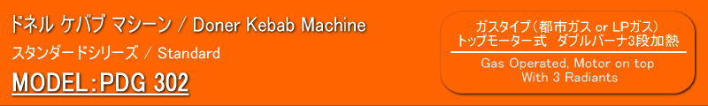 | 【商品説明】 ドネル ケバブ マシーン PDG 302 ・都市ガス又はLPガスを使用するタイプです。 ・セラミックヒーターは金網で保護されており交換も簡単にできます。 ・1列のダブルセラミックヒーターが3段になっており、各段ごとに火力の調整が可能です。 ・上部にセットされた回転モーター(1rpm)は左右回転の切り替えスイッチが付いています。 ・上部モーター部と下部をスライドさせることで肉とヒーターとの距離を変えることが出来ます。 ・ガス漏れ防止装置付きで火か消えると自動でガスが止まる仕組みになっています。 ・ショベル、オイルパンが付属しております。 *本体にコンセントが付いていますが使用できません。 *モーターの電源は単相230Vで、別途変圧器が必要です。 【General Features】 ・Possibility of operating the radiants seperately and with high- low capacity , ・Easy to replace protective wire in front of the radiants , ・Sliding upper and lower housings of the skewer for bringing meat closer to or taking away from the heaters , ・shovel with bakalite handle , ・Special motor (1 rpm) positioned at the bottom resisting to high temperatures, rotating left/ right , ・Maintaining the distance fixed to the heaters depending on the slanted operation of the skewer with meat , ・In case of flame turns off , gas valves stops the delivery of gas automatically , |