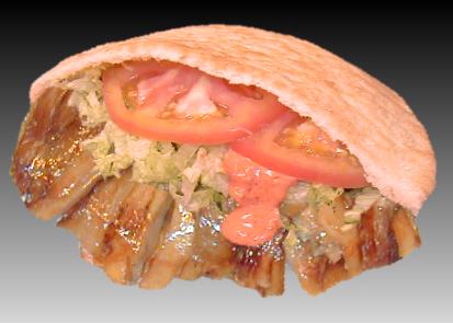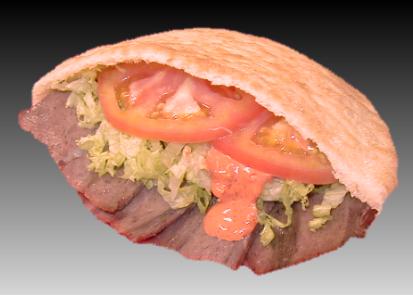 ビーフケバブ Beef Kebab ビーフの削ぎ切り肉と野菜、ソースをピタブレッドに挟んだ物。 |
