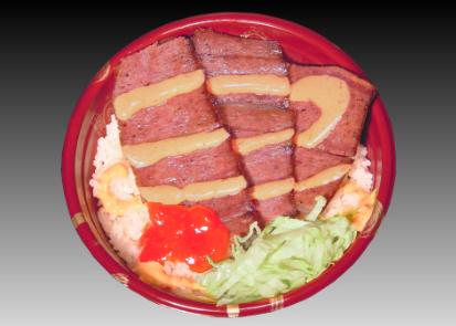 ビーフケバブライス Beef Kebab Rice ライスの上にビーフの削ぎ切り肉とレタス、トマトソース、ヨーグルトソースで盛り付けたトルコ風どんぶり。 |