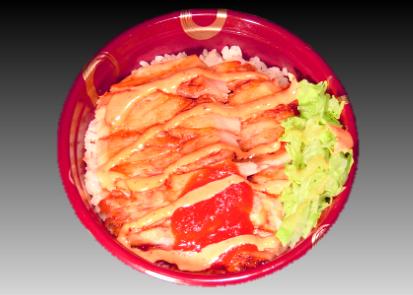 チキンケバブライス Chicken Kebab Rice ライスの上にチキンの削ぎ切り肉とレタス、トマトソース、ヨーグルトソースで盛り付けたトルコ風どんぶり。 |